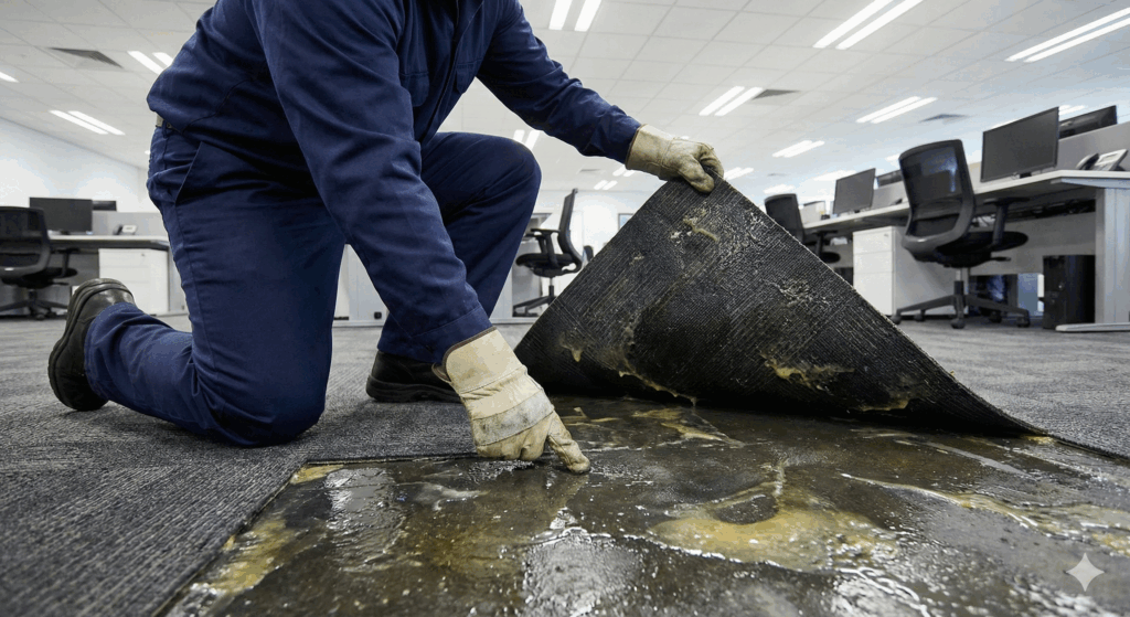 Consider your installation type. Is your facility using glue-down carpeting (common in offices)? This is often easier to salvage because there is no pad to sponge up water. However, if the water degrades the adhesive, you may face “bubbling” or delamination later, where the secondary backing separates from the primary backing.